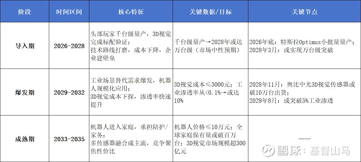 核心标志是特斯拉Optimus、优必选等头部玩家实现人形机器人千台级量产,3D视觉作为标配部件完成工业场景的技术验证。