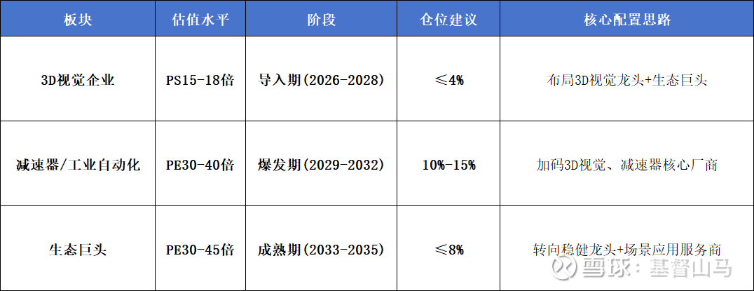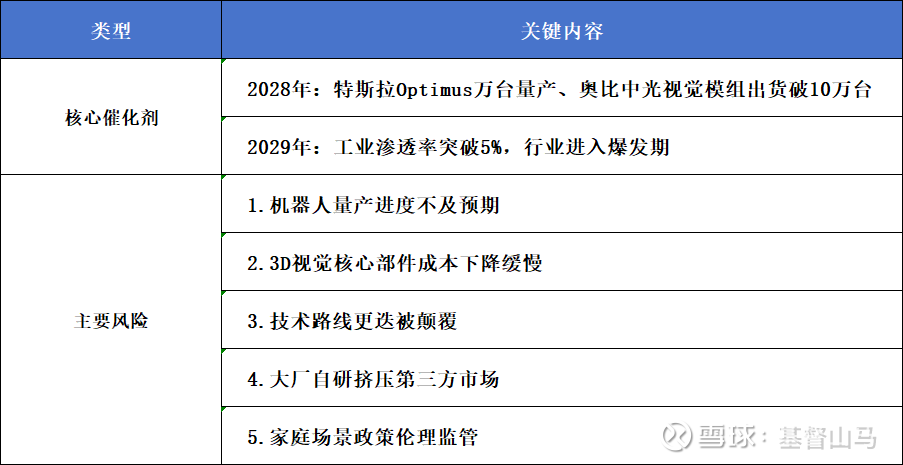 随着机器人从执行指令向自主决策升级,3D视觉在整机BOM(物料清单)成本中的占比将持续提升,长期有望成为仅次于伺服电机的第二大价值增长级。