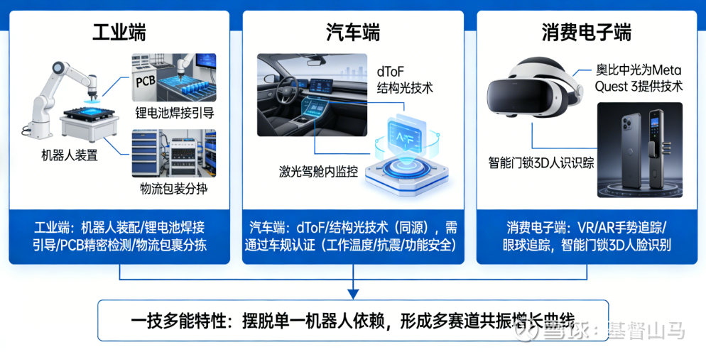 汽车端,底层dToF、结构光技术与智能驾驶舱内监控、激光雷达等感知模块技术同源,但需通过严格的车规认证(工作温度、抗震、功能安全)后方可切入。