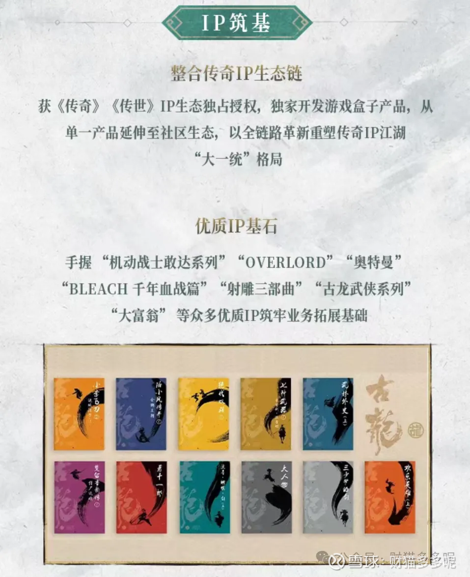 公司擅长在全球范围内搜寻、引入富有品牌潜力的 IP,力争最大限度挖掘提升 IP 品牌价值。目前,公司已经获得“机动战士敢达系列”“OVERLORD”“关于我转生变成史莱姆这档事”“信长之野望:天道”“热血江湖”“倚天屠龙记”“仙剑奇侠传”“盗墓笔记”“斗罗大陆”“BLEACH 千年血战篇”“奥特曼”“拳皇”“射雕三部曲(射雕英雄传、神雕侠侣、倚天屠龙记)”“红月”“古龙群侠(古龙武侠系列小说)”“轩辕剑”“希望 OL”“仙境传说”“黑猫警长”“大富翁”等知名 IP 授权,成功推出《新倚天屠龙记》《刀剑神域黑衣剑士:王牌》《魔神英雄传》《敢达争锋对决》等产品。强大的优质 IP 获取及商业化能力已成为公司核心竞争力之一,为公司研发新兴力作不断提供强劲助力。