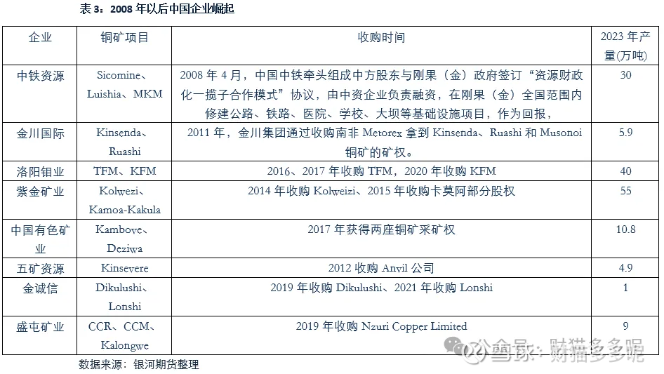 2007年,中国政府与刚果(金)达成“矿产资源换基础设施”协议。中铁资源、洛阳钼业、紫金矿业、中国五矿、中色集团、金川集团、盛屯矿业等成为主力军。