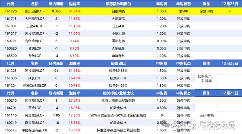 161225、161038等是股票资产溢价虽高且不限额申购,风险高多博弈看自己,首选大宗类资产,如160216和164701溢价不错,但今天暂停申购。