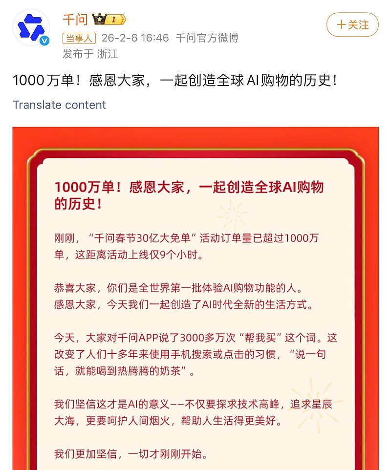 千问搞的这个春节30亿免单活动,上线9小时活动订单超1000万单