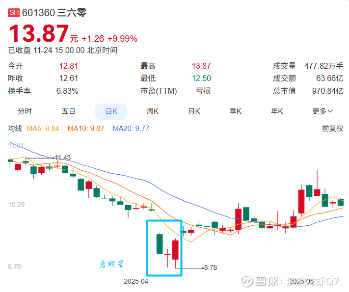 以2025年4月初的$三六零(SH601360)$ K线走势图为例,股价在经历近一个月的震荡下跌后,于4月7日拉出一根超级大阴线,收盘价为9.13,随后在4月8号低开微涨,收盘于9.12,形成价格跳空,构成星线,之后在4月9号拉出一根大阳线,收盘于9.45。虽然这根阳线没有与8号的星线实现价格向上跳空,但其实体却显著地深入到4月7日阴线实体内部,构成有效的启明星形态。同时,启明星形态中的价格最低点8.78构成了今年年内最坚实的底部支撑水平。