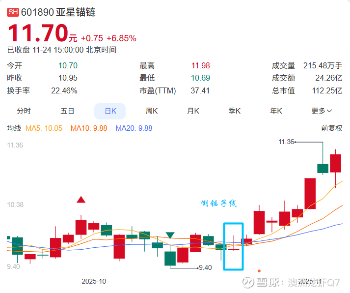 以$亚星锚链(SH601890)$ 在2025年10-11月的行情为例,该股票在10月份经历了近一个月横向整理态势,于10月24号形成了一根倒锤子线收盘于9.70,并在10月25号拉出阳线收盘于9.86,次日收盘价高于倒锤子实体上方的上涨信号得到验证,并形成了一个为期两周的短期上涨行情。