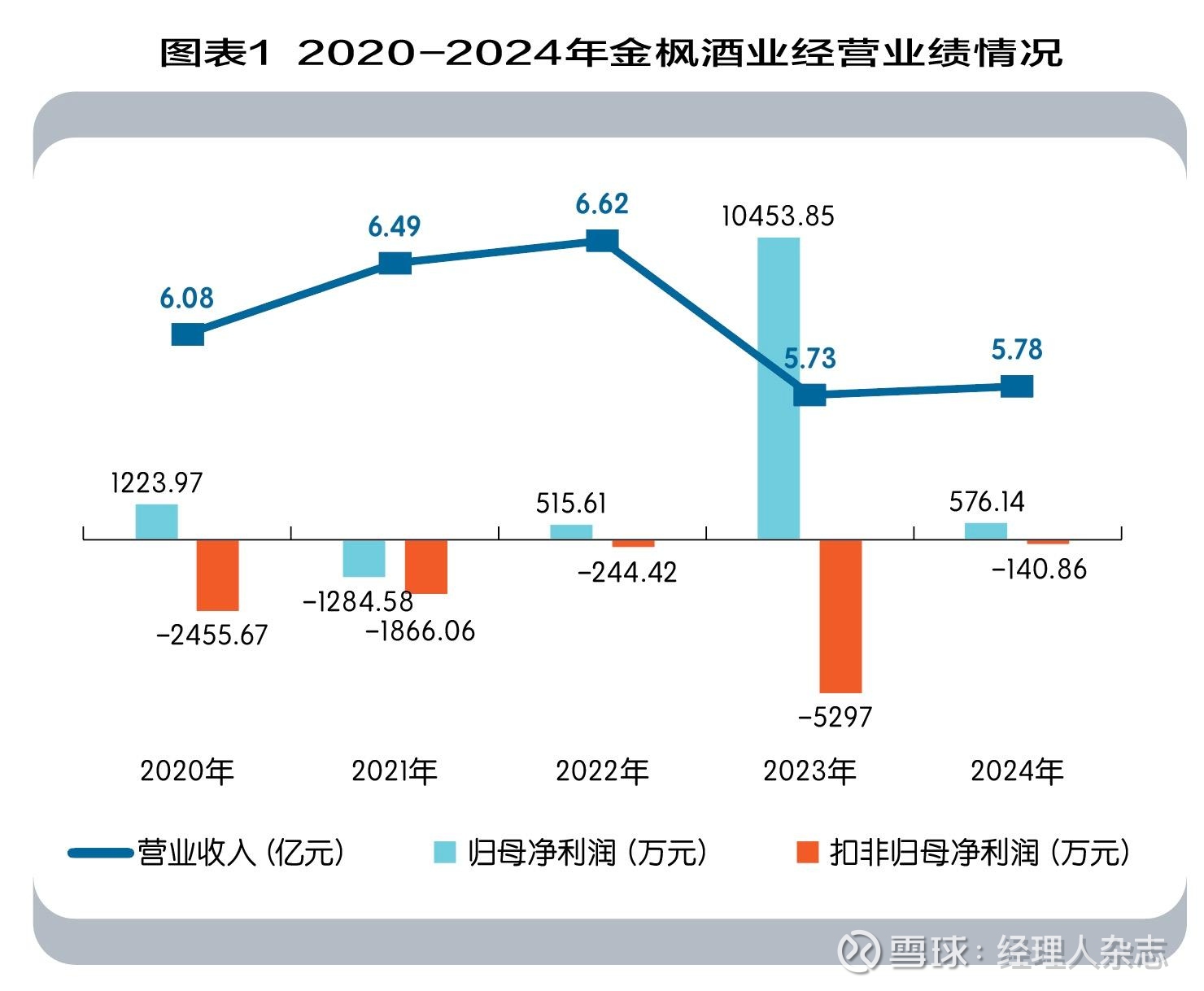近五年,2020年-2024年,金枫酒业业绩较为“惨淡”,如图表1所示,公司营业收入分别为6.08亿元、6.49亿元、6.62亿元、5.73亿元、5.78亿元,归母净利润起伏较大,2021年亏损1824.58万元,2023年又增长至1.05亿元,2024年又骤降至576.14万元。然而,同期内,公司扣非归母净利润一直处于亏损状态,分别为-2455.67万元、-1866.06万元、-244.42万元、-5297.00万元、-140.86万元,已经连续5年为负。
