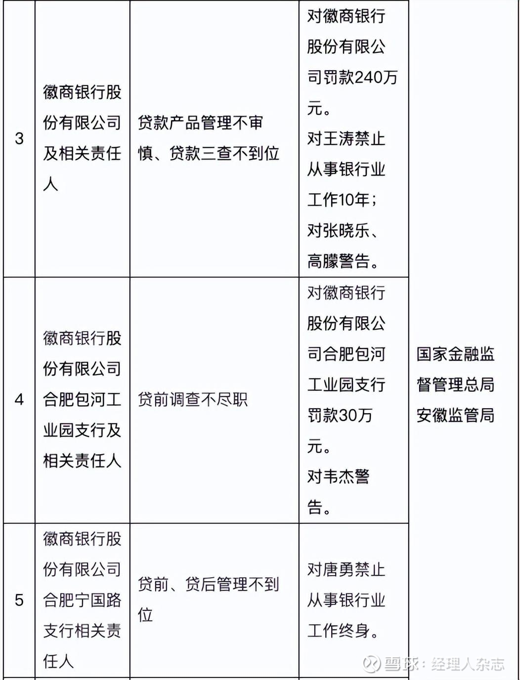 10月,徽商银行因贷款产品管理不审慎、贷款三查不到位,被安徽金融监管局处罚240万元。同时禁止王涛从事银行业工作10年;对张晓乐、高朦给予警告。