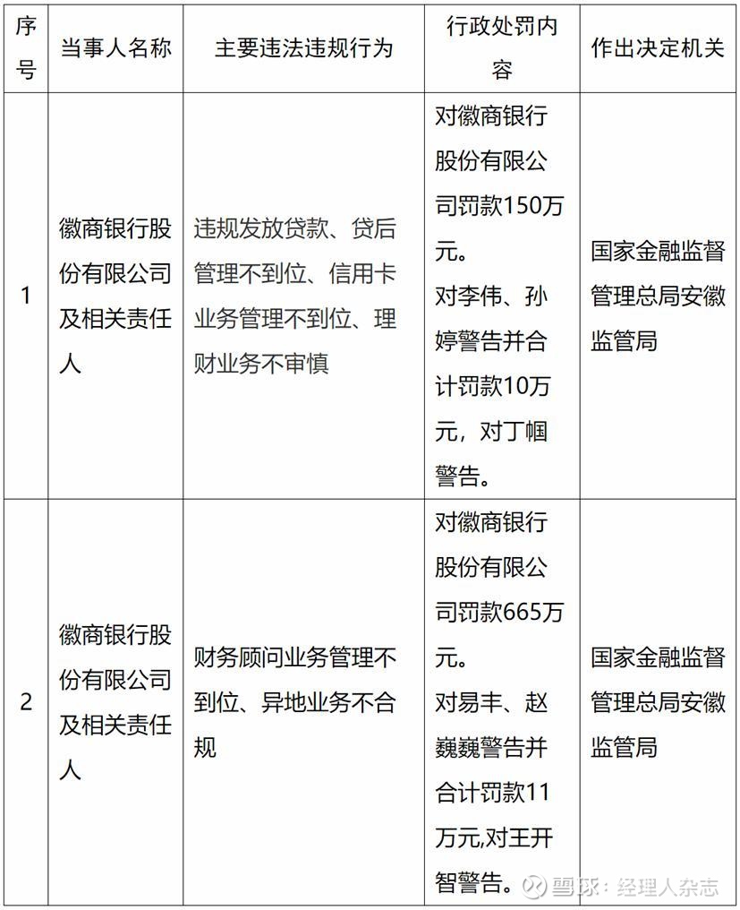 具体来看,徽商银行因违规发放贷款、贷后管理不到位、信用卡业务管理不到位、理财业务不审慎,被罚150万元;相关责任人李伟、孙婷受到警告并合计罚款10万元,责任人丁帼受到警告。