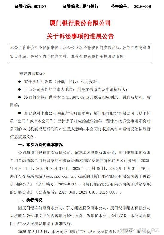 2026年3月6日晚间,厦门银行(601187.SH)发布诉讼进展公告,披露其与厦门银祥油脂有限公司(下称“银祥油脂”)、东方集团股份有限公司(下称“东方集团”)、厦门银祥集团有限公司(下称“银祥集团”)的4.19亿元金融借款合同纠纷,已正式进入强制执行阶段。厦门市中级人民法院于3月5日受理该执行申请,出具(2026)闽02执2459号《受理案件通知书》,标志着这场历时近一年的金融纠纷进入债权追偿的关键环节。