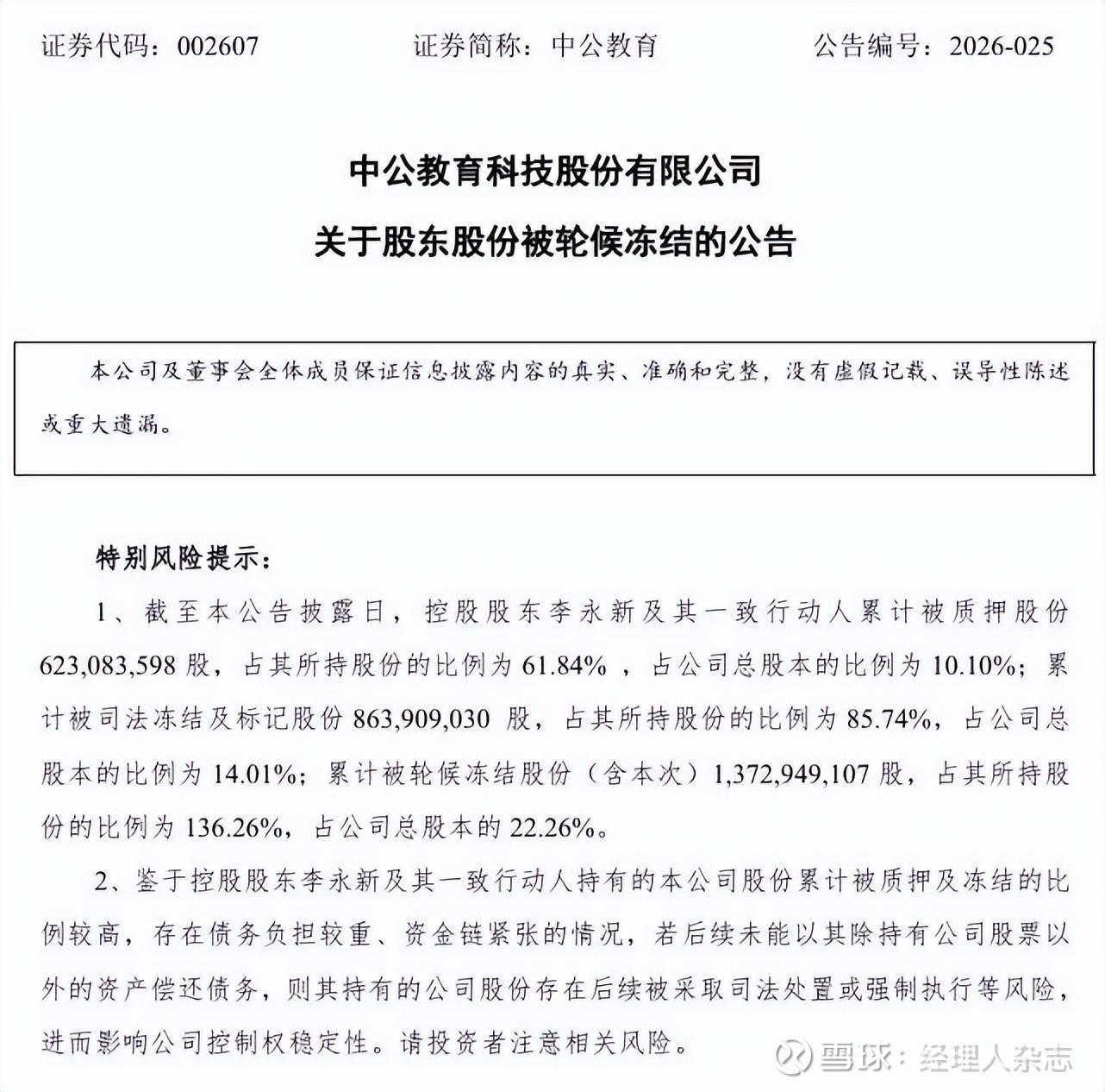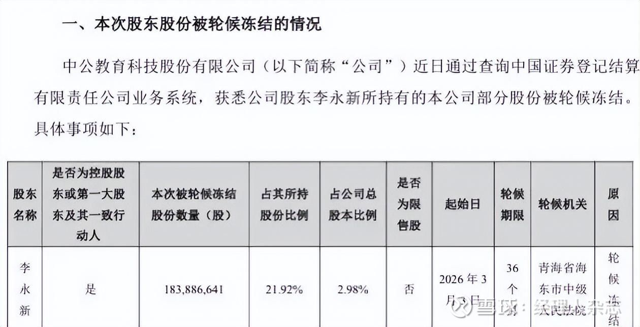 中公教育(002607.SZ)控股股东股份冻结风波持续发酵。3月6日,公司公告披露控股股东李永新所持1.84亿股股份被青海省海东市中级人民法院轮候冻结,涉案金额约1.395亿元。3月10日,公司通过互动平台集中回应市场关切,明确无管理层更换计划,同时提示控股股东高比例质押冻结下的控制权稳定性风险。