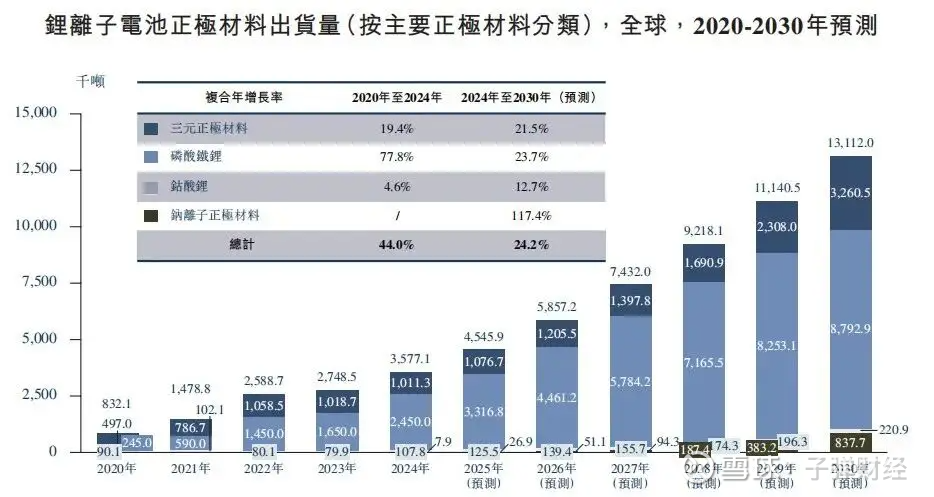 弗若斯特沙利文披露的数据显示,2022年至2024年三元正极材料出货量分别为1058.5千吨、1018.7千吨、1011.3千吨,出货量几乎没有增长。同期,磷酸铁锂正极材料出货量分别为1450千吨、1650千吨、2450千吨。