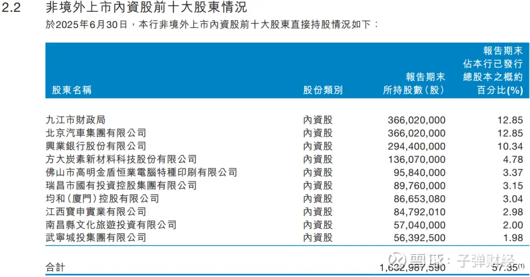 2025年半年报显示,九江银行的前三大内资股股东持股比例分别为:九江市财政局(持股15.78%)、北汽集团(持股12.85%)、兴业银行(持股10.34%)。