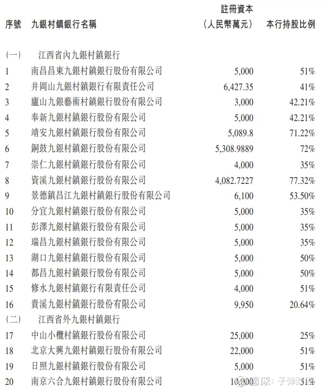 (图 / 九江银行旗下20家村镇银行名单(来源:九江银行公告))