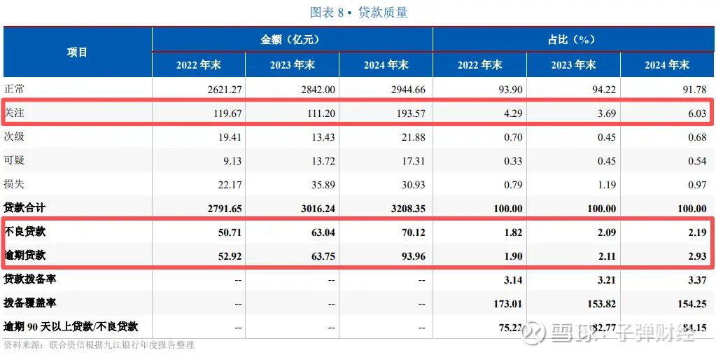 联合资信发布的九江银行2025年评级报告指出,该行2024年不良贷款率有所上升,关注类贷款占比较高,拨备面临一定计提压力,房地产行业的风险敞口仍较大。