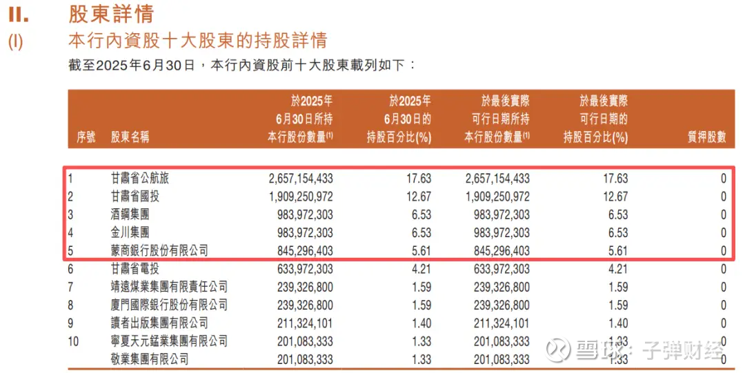(图 / 甘肃银行2025年上半年内资股前十大股东(来源:甘肃银行2025半年报))