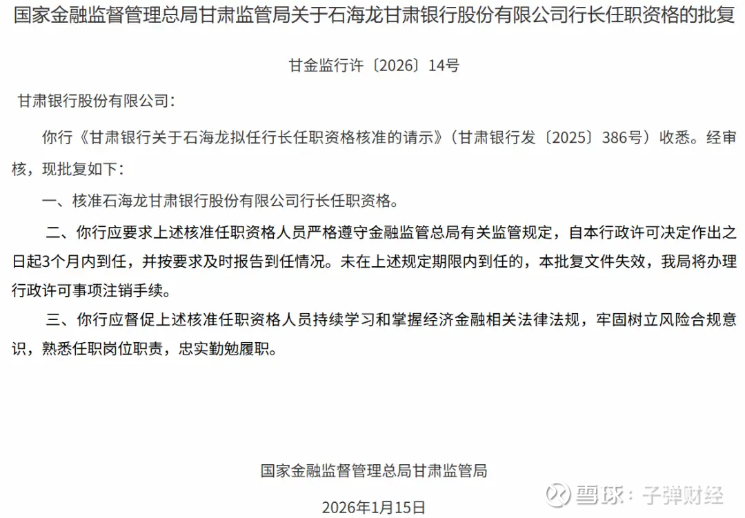 2026年1月中旬,国家金融监督管理总局甘肃监管局正式核准石海龙担任甘肃银行股份有限公司(以下简称“甘肃银行”)行长的任职资格。