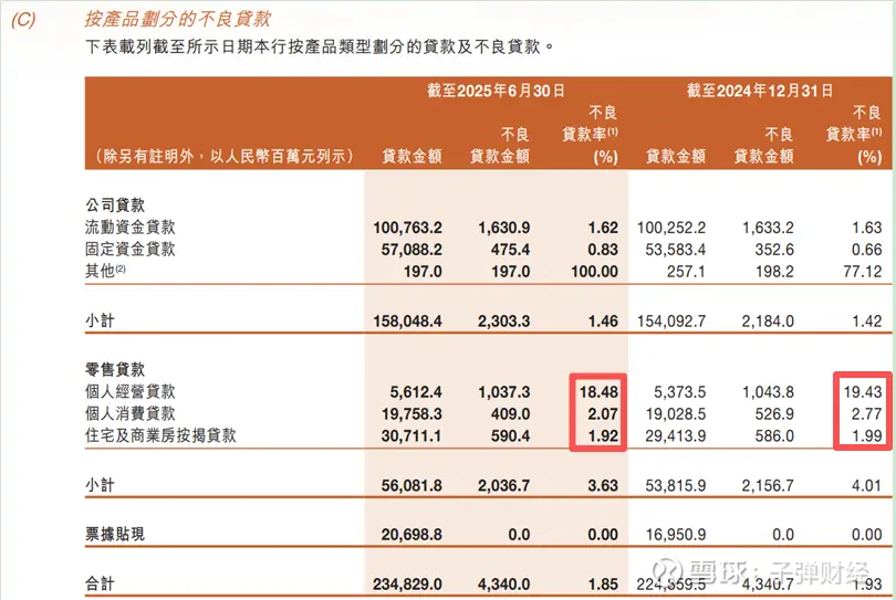 在该行零售贷款业务中,个人经营贷款不良率最高,达到了18.48%。其次是个人消费贷款,不良率为2.07%。
