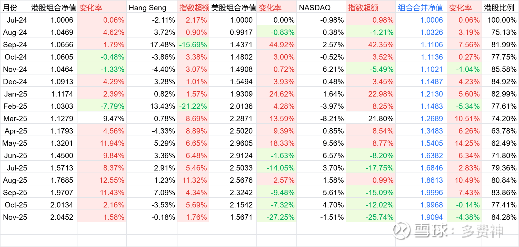 2025年11月月度业绩-4.38%。恒生指数11月表现-0.18%,纳斯达克综合指数11月表现-1.51%。港股比例为84.28%,剩余为美股。