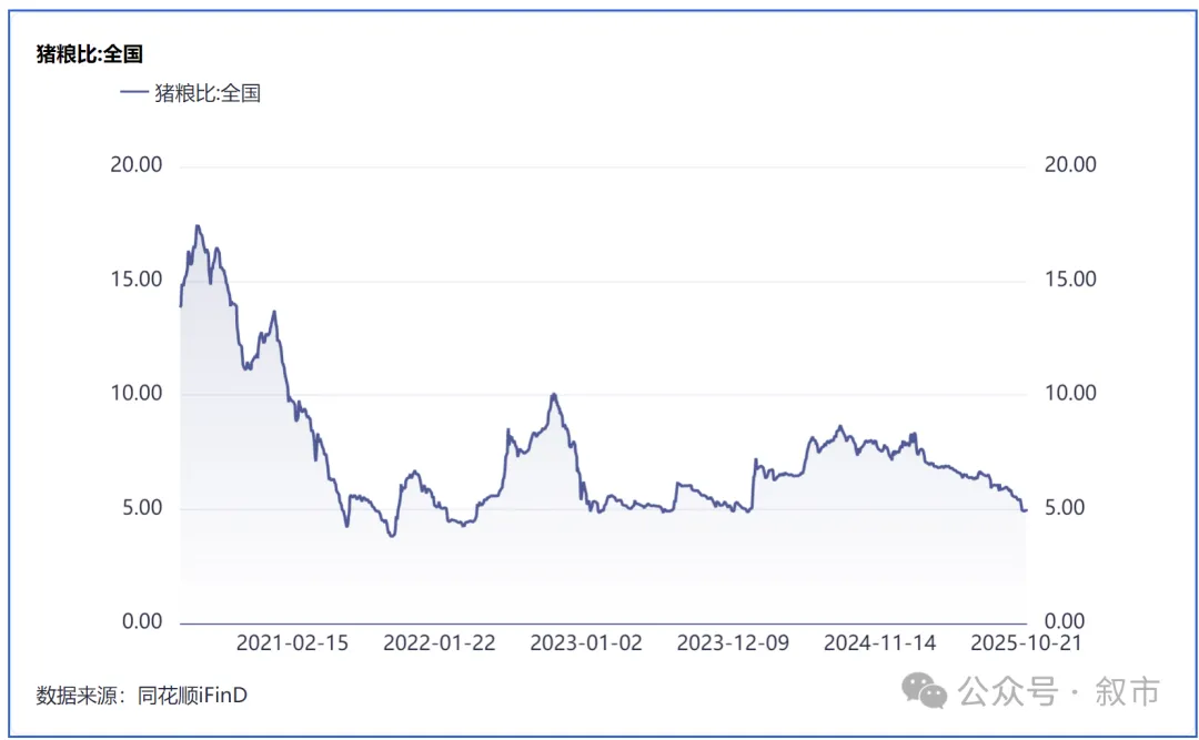 3、猪肉价格持续走低,猪粮比价节后一直在降低,今天从4.95反弹0.05,回到5。