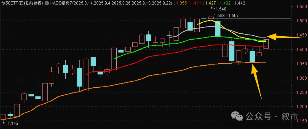 5、宽基指数中,近期最容易做的是$创50ETF(SZ159681)$ ,上周多次回踩KDAS橙线被支撑反弹,今天开始挑战1.442压力位。