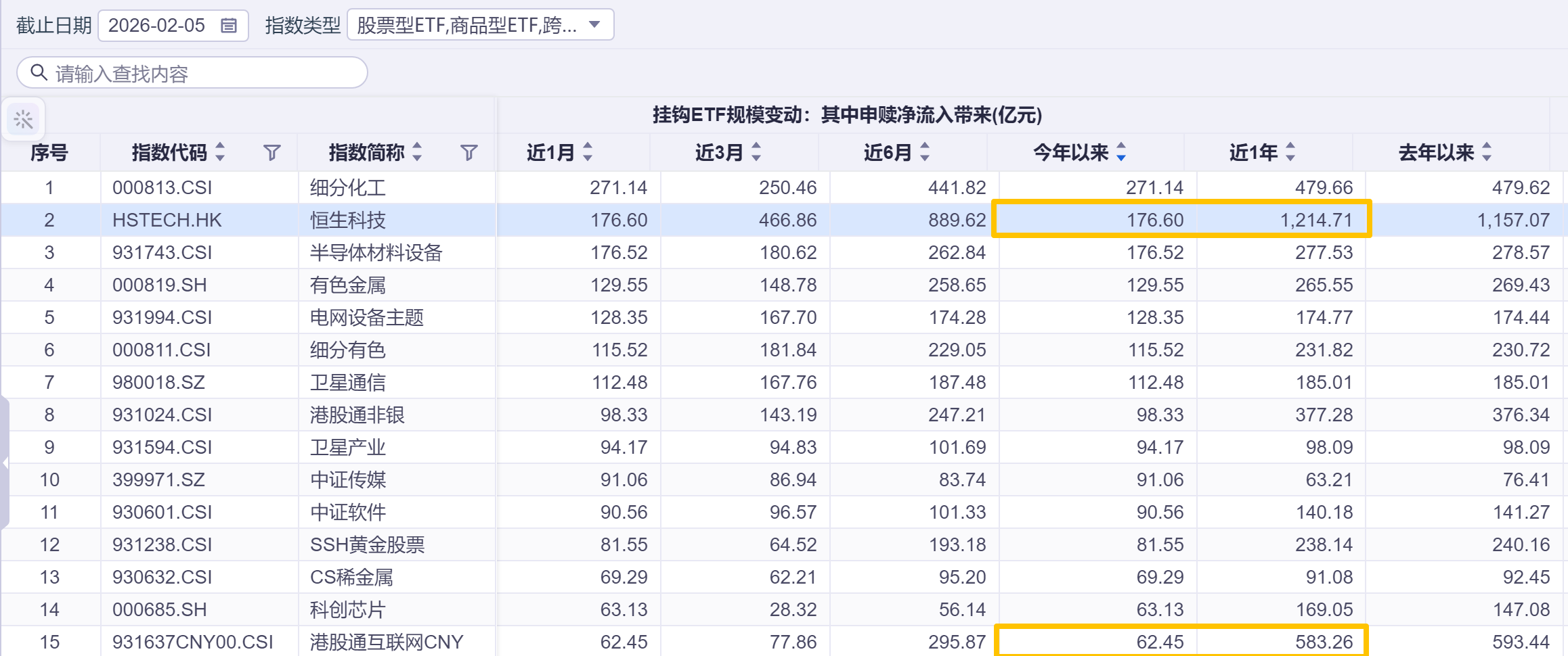 现在拉长周期看,最后一列,去年以来,只有恒生科技+港股通互联网,还有1157+593亿净申购。