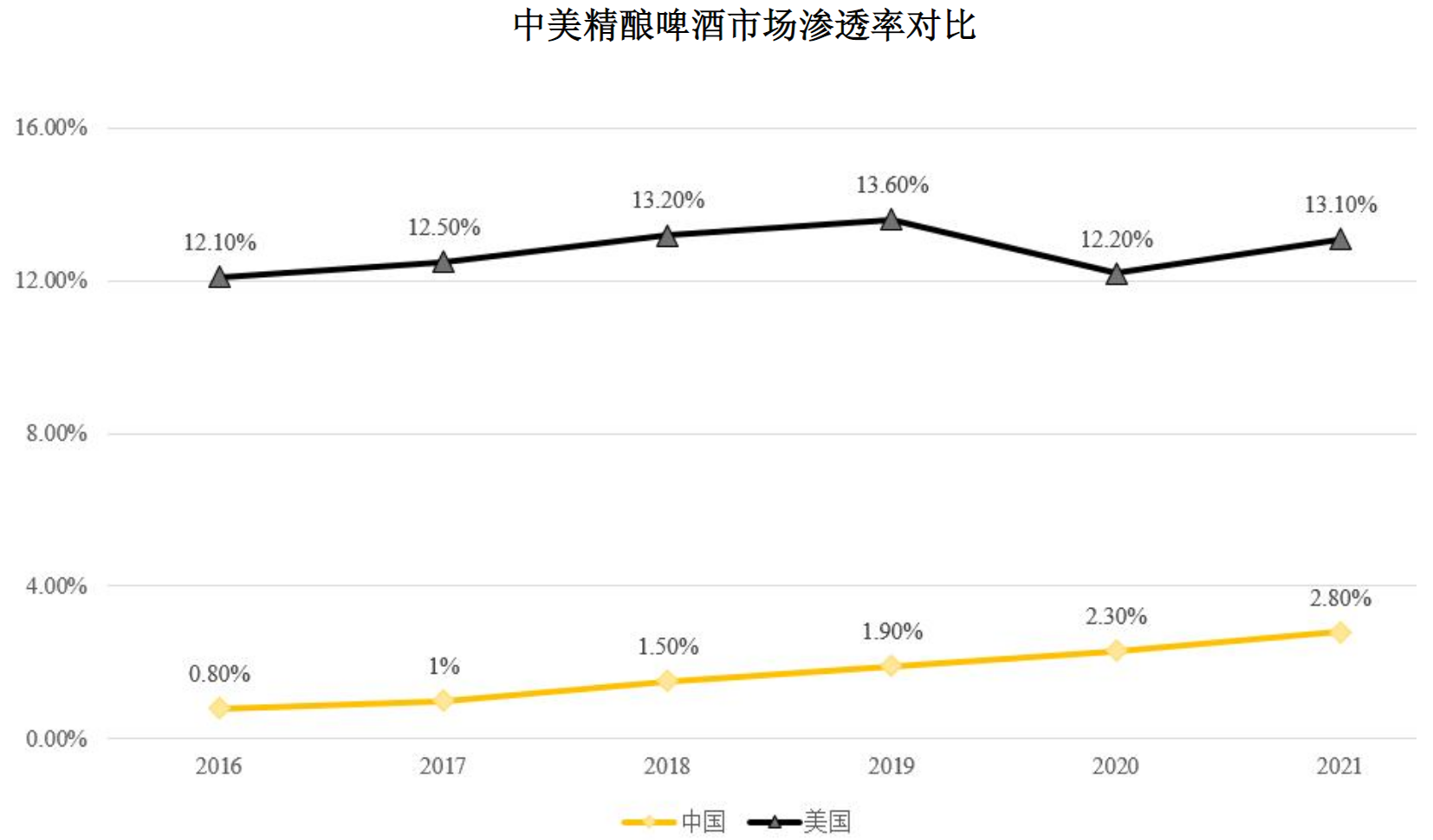 2016年美国与我国精酿市场渗透率分别为12.1%、0.8%,美国是中国市场的15倍,到2021年,美国与我国精酿市场渗透率分别为13.1%、2.8%,仍为中国市场4.68倍。