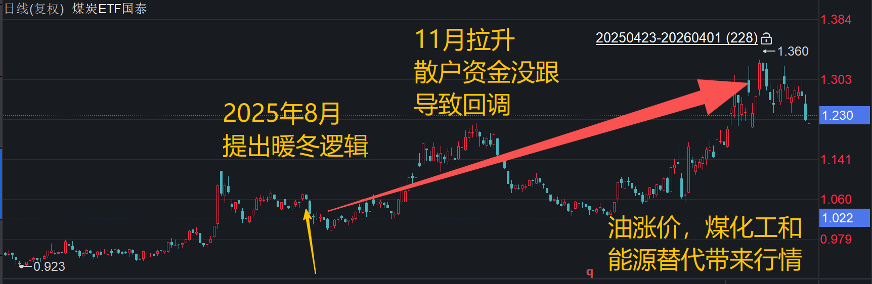 去年8月,提出暖冬逻辑,煤价反弹的时候,开始布局$煤炭ETF国泰(515220)。
