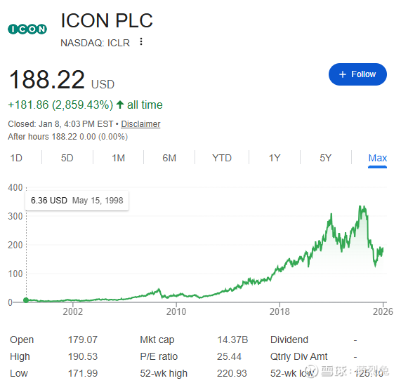 ICON 于 1990 年由 John Climax 博士和 Ronan Lambe 博士在爱尔兰都柏林创立 。这两位医生敏锐地察觉到,随着药物研发监管环境的日益复杂,制药公司迫切需要将临床试验的运营环节外包,以提高效率并降低固定成本。公司起步时仅有 5 名员工,专注于欧洲市场的数据管理和监管咨询。然而,创始团队很快意识到,制药行业本质上是全球化的。为了承接跨国药企的订单,CRO 必须具备全球交付能力。1991 年,成立仅一年后,ICON 就在英国开设了第一个海外办事处。1992 年,公司进军美国费城,这是极具战略意义的一步,确立了其在当时全球最大医药市场的立足点。随后,德国(1995 年)和日本(1996 年)办事处的设立,迅速构建了横跨美、欧、亚的“铁三角”运营网络 。这种早期的全球化布局是 ICON 区别于许多区域性 CRO 的关键基因。1998 年,ICON 在纳斯达克完成首次公开募股(IPO)。这次融资不仅提供了扩张资金,更重要的是建立了其作为一家受美国证券法监管的透明实体的信誉,这对于赢得大型制药公司的信任至关重要。