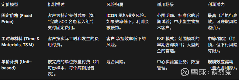 Functional Service Provision (FSP): ICON 向客户提供特定的专业人员(如临床监查员 CRA、数据管理员),这些人嵌入客户的内部团队工作。类似于高端人力资源外包。利润率较低但非常稳定,通常按小时计费(Time & Materials)。大型制药公司(Big Pharma)倾向于这种模式以保持对试验的控制权。【让我觉得可以类比成本加成制合约,不可能赚很多钱,但相对来说比较稳定。】