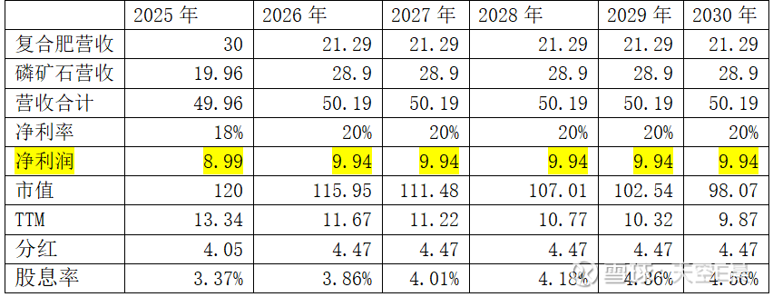 净利率保守按照2025年前三个季度净利率18%计算,随着高净利的磷矿石占比提高2026-2030按照20%净利率计算,考虑到磷矿石供给有增长,2026 年国内将新增 11 座磷矿山,总新增产能达 2125 万吨 / 年,投产节奏较均衡:上半年释放 1200 万吨 / 年,下半年释放 925 万吨 / 年。供给增加会对磷矿石价格产生压力,因此在2026-2030年利润没有增幅。