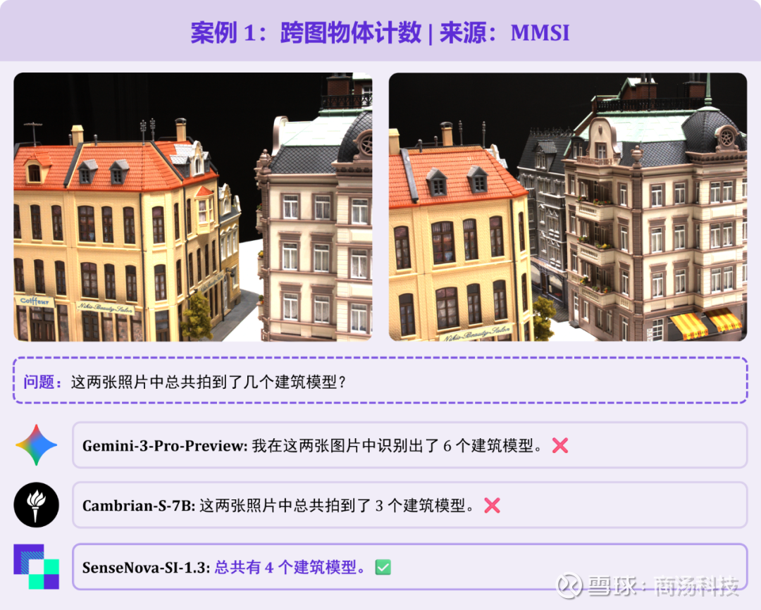 题目要求统计两张照片中建筑模型的总数量,核心难点是理解两张图的对应关系,以此避免遮挡漏数和重复多数。图2视角下显现出图1中被遮挡的深灰色建筑,且部分模型在两图中重复出现。Gemini-3-Pro未完全去重,误数为6个;SenseNova-SI-1.3则给出“4 个”的准确答案。