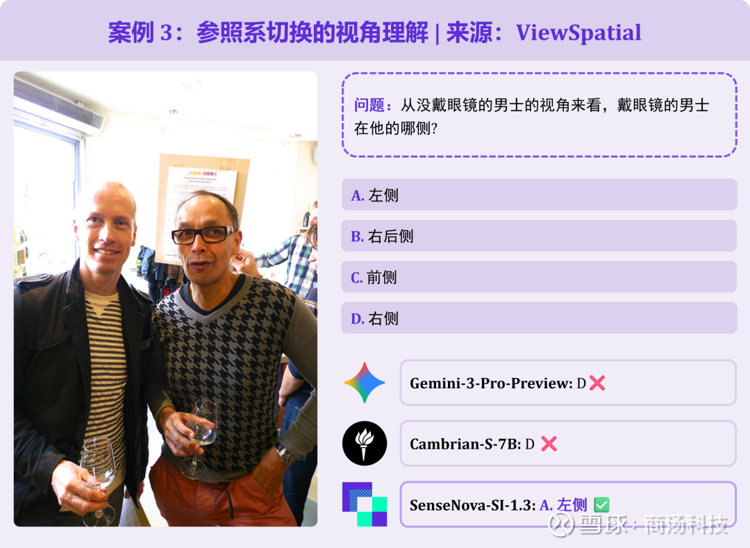 题目要求以“未戴眼镜男士的自身视角” 判断身旁戴眼镜男士的方位,考察“参照系转换” 能力,模型很容易以“观察者视角”来判断方向。Gemini-3-Pro就误选了 “右边”;SenseNova-SI-1.3则能正确给出“左边” 的正确答案。