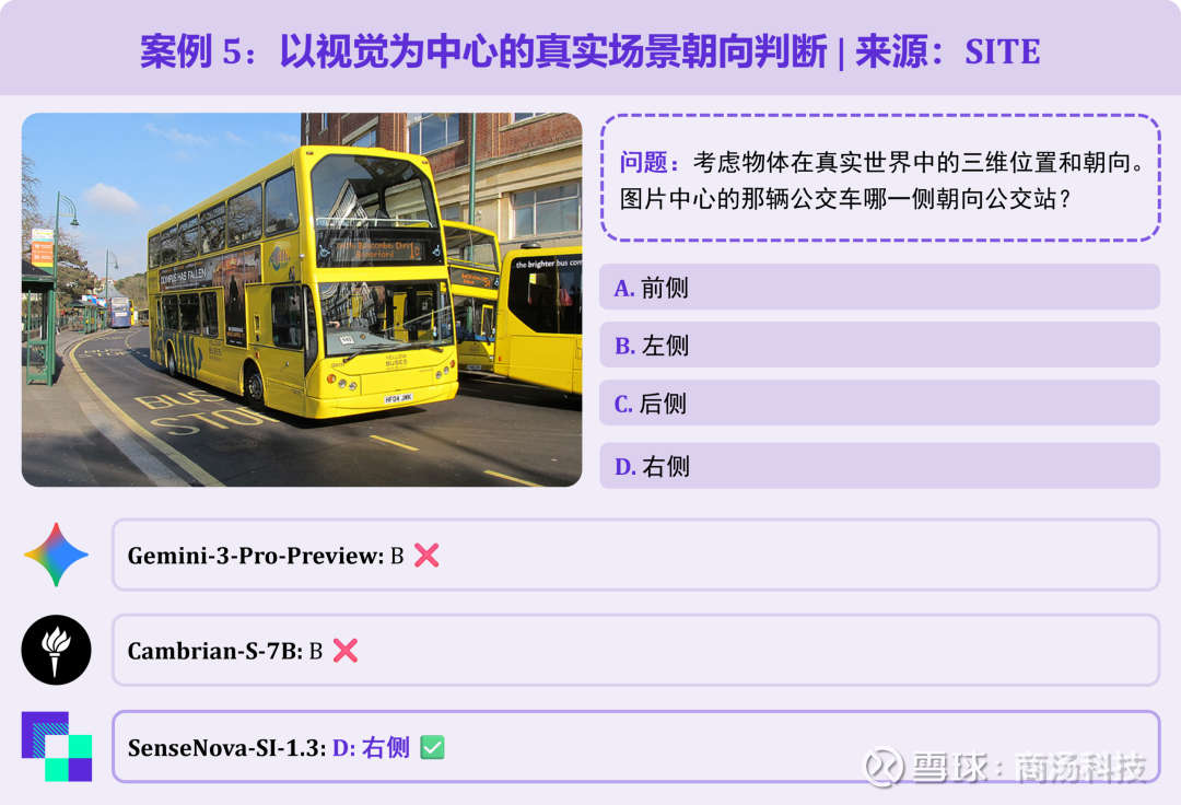 以双层巴士与公交站的场景为题,需避免陷入“英国巴士靠左行驶,因此靠站的是左侧”的常识陷阱,而是通过实际的视觉画面判断方位。Gemini-3-Pro误判 “左侧” 为答案;而 SenseNova-SI-1.3则准确理解 “右侧” 为正确答案。