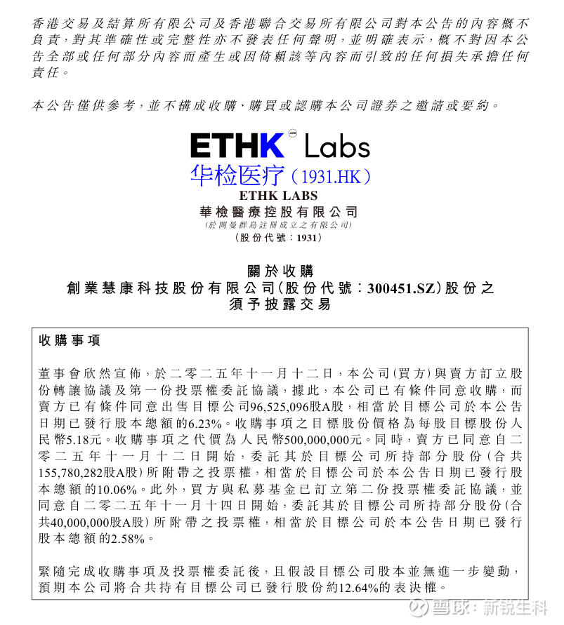 华检医疗(01931.HK)11月16日公告,通过全资附属公司杭州更好智投管理咨询合伙企业(有限合伙)作为买方,以人民币5亿元收购创业慧康(300451.SZ)6.23%股权,并同步签署两项表决权委托协议,分别获得葛航先生所持10.06%股份及锦福源私募基金所持2.58%股份的表决权。