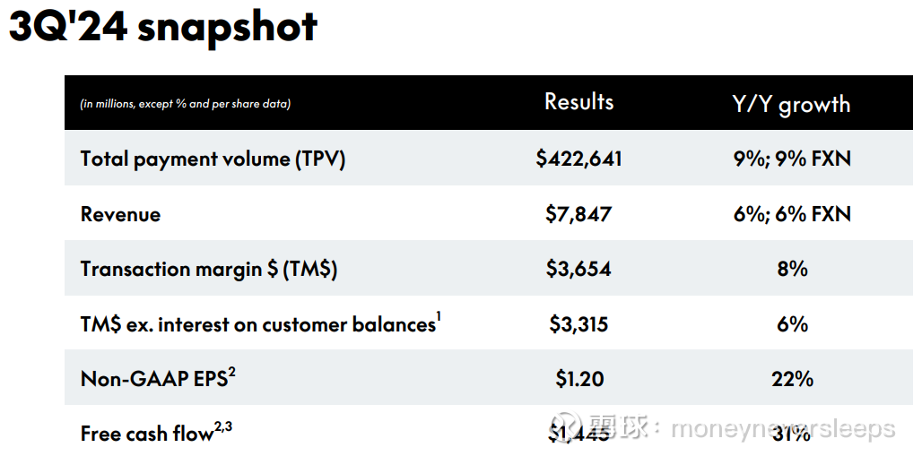 Paypal三季度GPV438billion,收入7.8billion,交易收入7billion。净利润1.12billion
