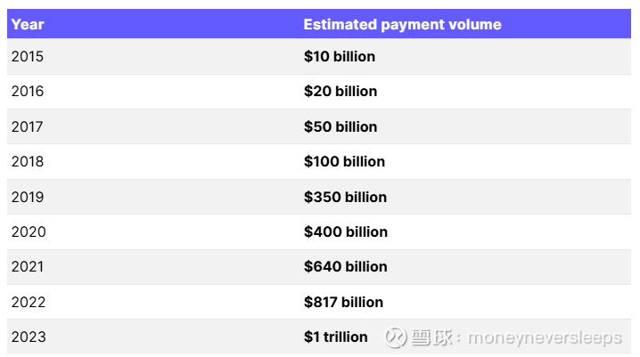没有找到Stripe的最新数据,2023年volume的增速是22.4%,Stripe这种公司现在和Paypal是即竞争又合作的关系。简化的理解Stripe是针对商家的payment processor,Paypal又面临消费者端又有商家端是双向的平台,可以说即是issuer又是acquirer。