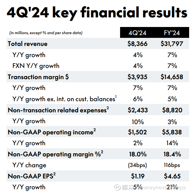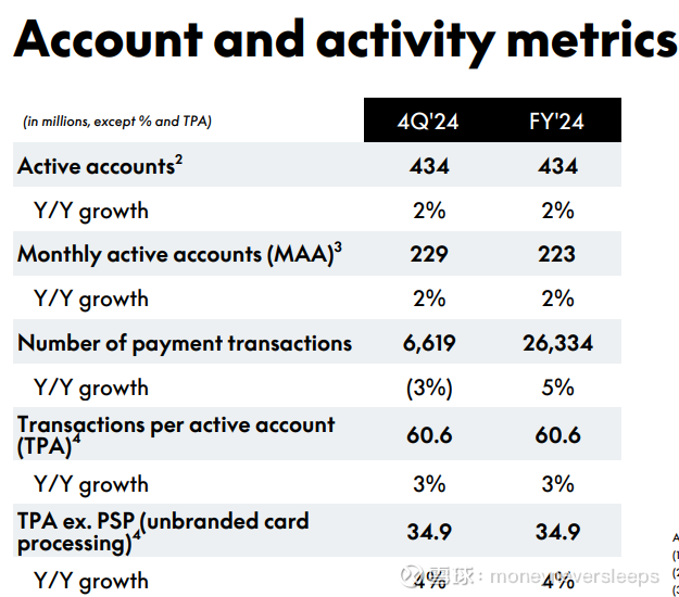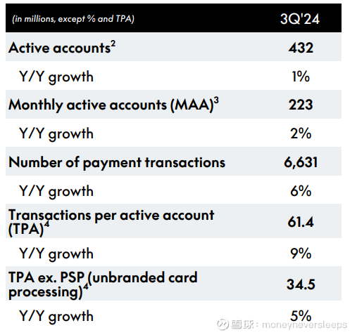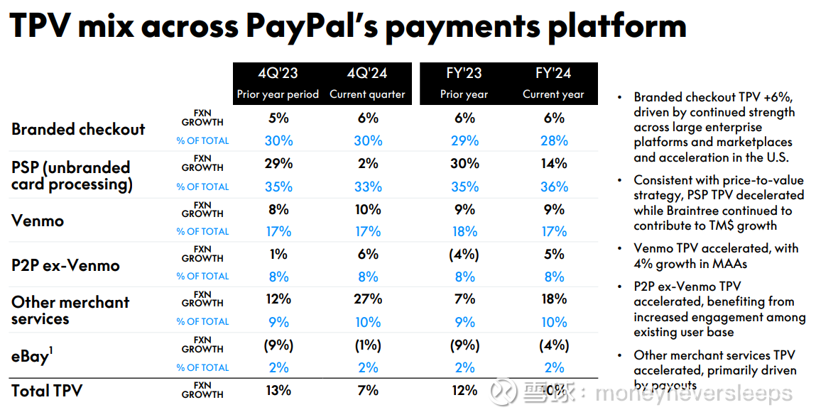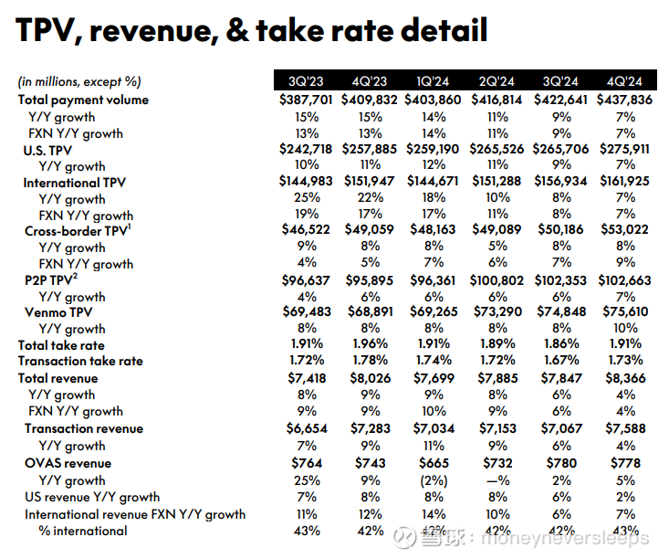 更清晰的交易量在各个业务的分布如下图,公司现在交易量branded业务占比28%,unbranded业务交易量占比36%,个人转账平台Venmo占比17%,除Venmo业务外的个人转账业务占比8%,其他10%,eBay占比2%。这些业务里面eBay在萎缩,其他商家服务业务量增速最高,四季度仍然在加速。个人转账业务增速平稳在9%左右。branded业务增速比较稳定在6%,不算特别亮眼。增速最快的是unbranded业务,但是这部分业务在24年增速大幅放缓,公司解释是主动的选择,后续需要继续观察。
