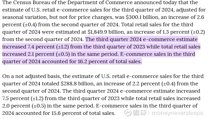 我比较关心paypal相对同行表现如何,有些公司数据不好找,和block对比2024年payment业务表现比block好(有意思的是股价上在paypal业绩后大跌后两公司的股价一年涨幅类似,看来paypal还没有表现出超越市场被认可的态势)。从美国电商增速的数据大概可以衡量paypal相对行业表现如何,根据三季度的数据美国电商增速在7.4%左右。Paypal美国TPV增速在9%,略超大盘,四季度美国的数据还没有,Paypal四季度表现了增速放缓的趋势,这是美国消费者开始疲软的表现还是Paypal自身的问题?需要更多数据观察。