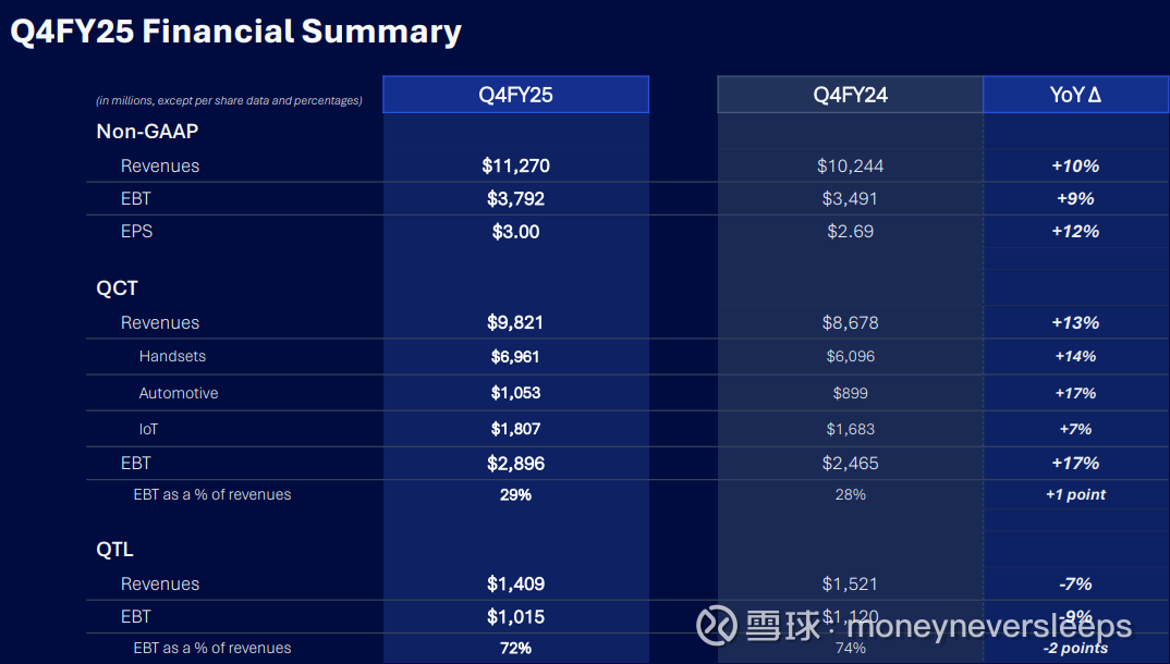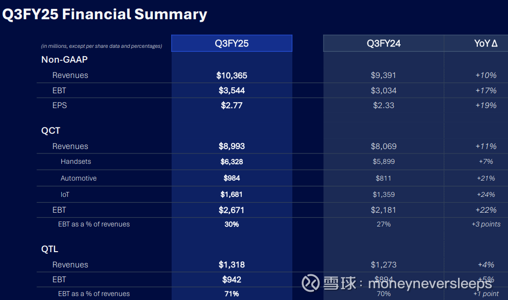 高通三季报业绩比较平淡,可以从和上个季度(25财年三季度)的对比看出,收入增速持平,利润率提升幅度减小。不过QCT(CDMA业务)增速加速,主要推动是手机,汽车和IoT增速都有放缓。licensing业务增速转负。高通最大的看点是推出AI推理优化的加速器,进军AI芯片市场。宣布之时股价涨了20%,后来回落依然涨幅11%。综合看下来我觉得$高通(QCOM)$ 值得仔细研究我先mark下。