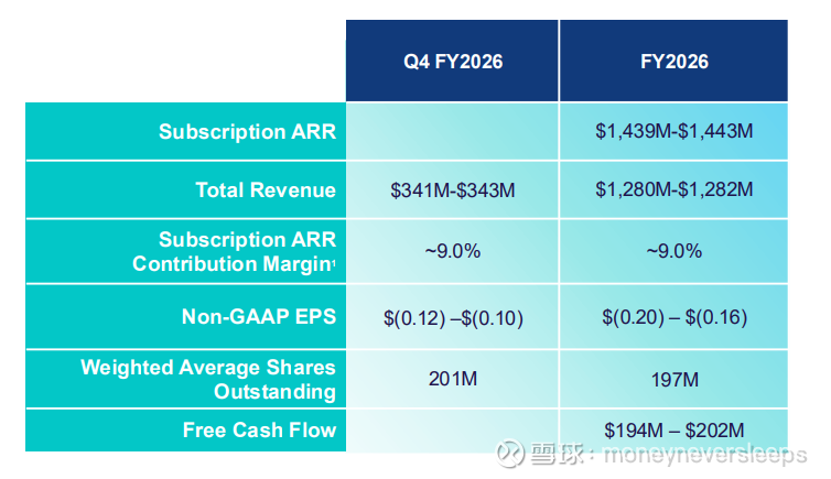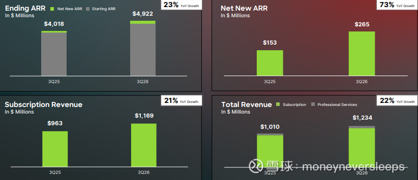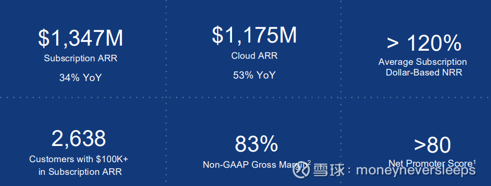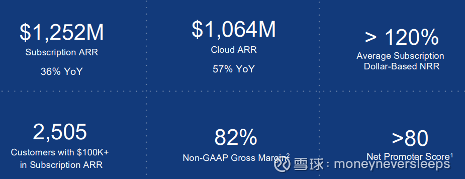 ARR同比增长23%到4.9billion,订阅收入同比增长21%到1.17billion,总收入同比增长22%到1.23billion。