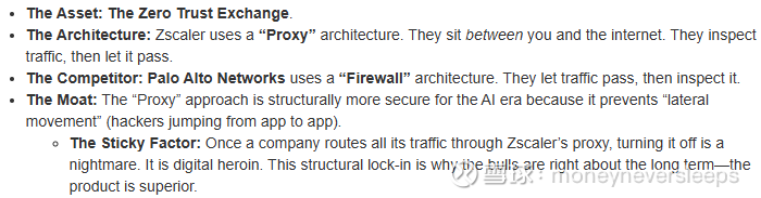 对于Zscaler的优势,有个解释说是他zero trust的架构要优于传统防火墙的架构。有很强的客户粘性。不过最近的一个说法是在SASE方面Zsclaler已经落后,Zscaler传统强项是SSE,而目前的融合趋势是SSE+SD-WAN(SASE),而Zscaler是没有SD-WAN能力的。不是技术咖,不理解这些信息是否正确。