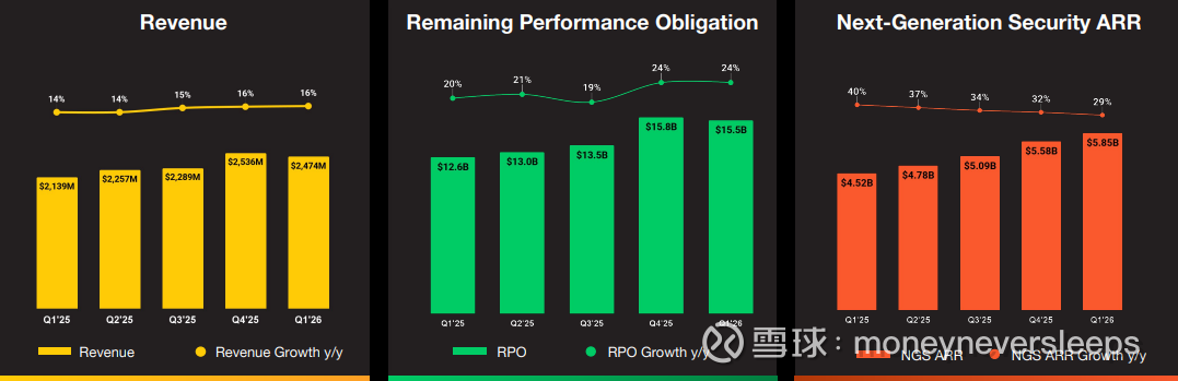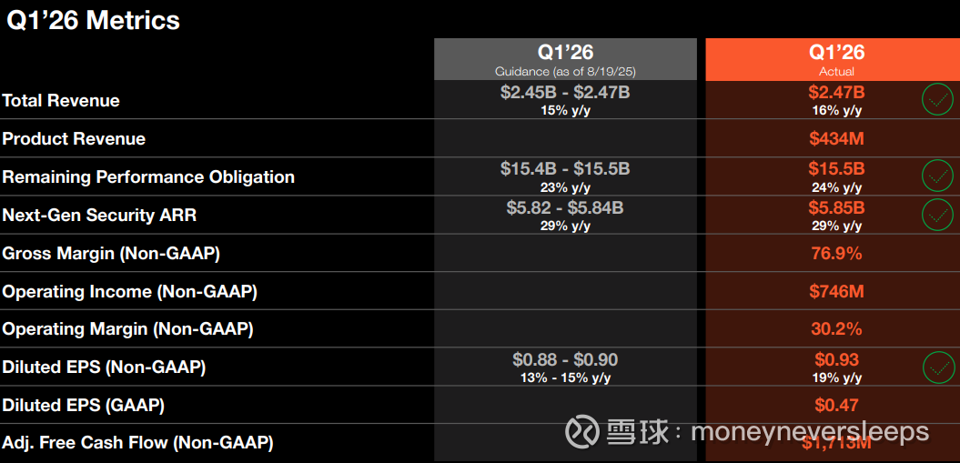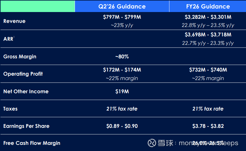 可比角度,26财年上半年+25财年下半年的收入为9889million。PS 13.8x。按照指引26财年Non-GAAP EPS,PE为51x,GAAP PE需要乘以2左右。对于一个收入增速CAGR可能在15%左右的公司,预期是非常长期的增长空间+利润率提升到大软件公司的利润率水平,不过从公司对利润率的指引来看,至少一年维度,利润率似乎是没有预期继续发挥operating leverage的,这样一个15%增速的公司是否能够撑得起13.8xPS呢?上个季度的季报后,因为看到业绩加速拐点当时认为PANW是可买标的,这次的业绩后认为当时的结论需要撤回。