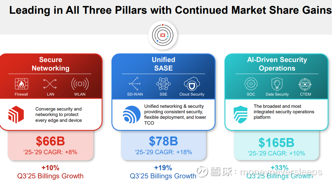 公司防火墙起家,在networking方面最强,目前是最大业务,billings占比63%。过去几年拓展到unified SASE,billings三季度增速19%,快于市场增速,目前该业务的大企业渗透率15%(防火墙渗透率50%,SD-WAN渗透率大于70%);目前还在比较初期的业务是Security Operations,billings增速33%。所以公司也是可以清晰看到增长点在哪里。
