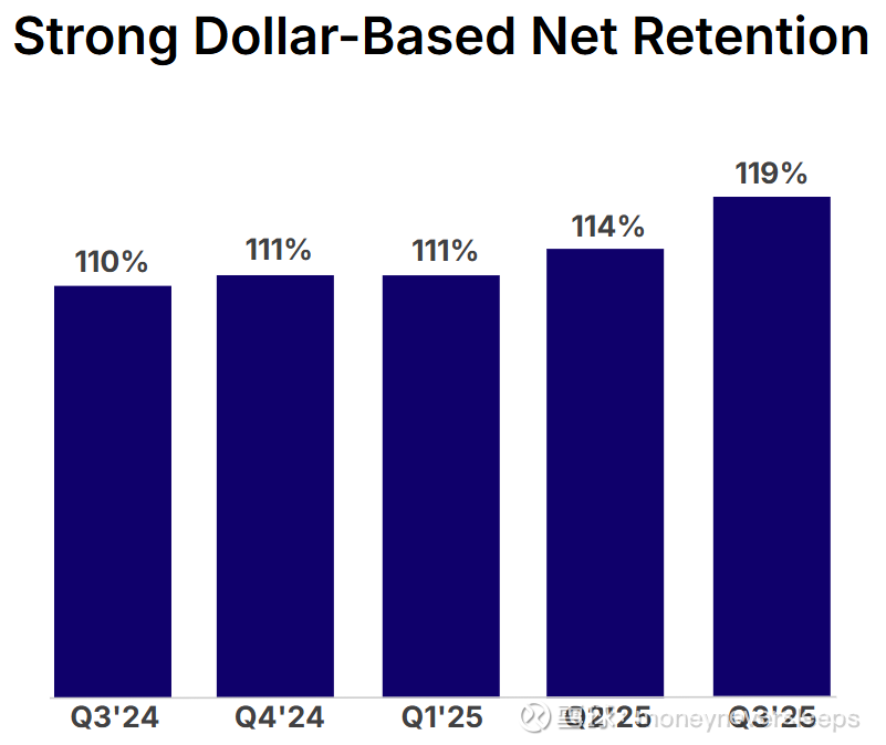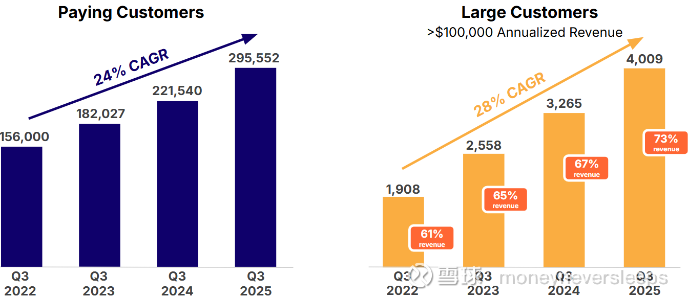 客户数增速保持24%CAGR,看趋势,今年三季度的客户数速相较去年是加速的。而大客户(年收入超过100K)的收入贡献占比逐年提升。