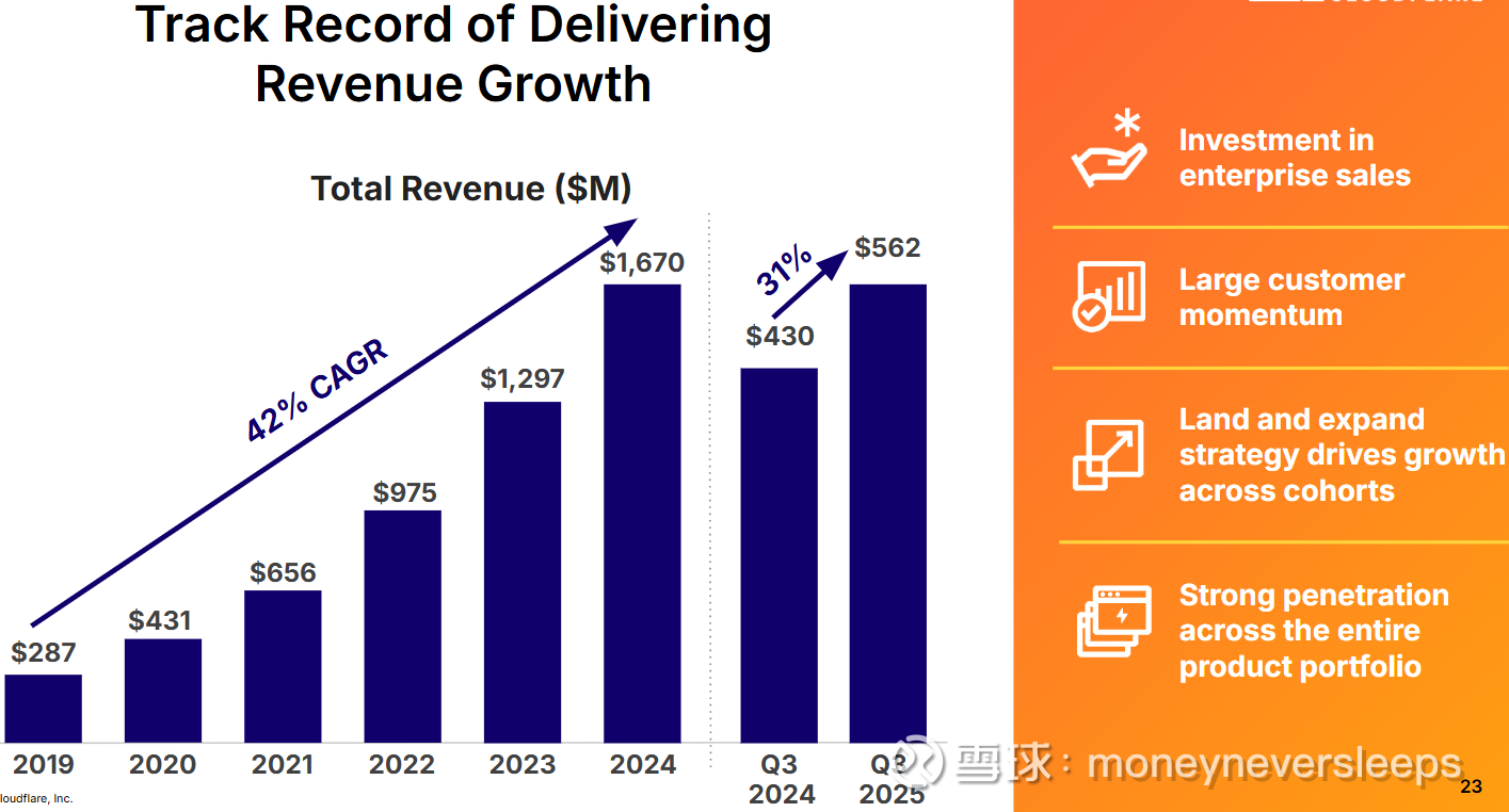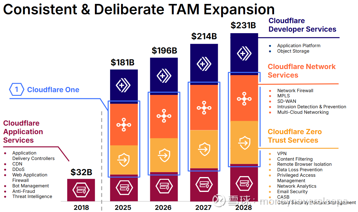 公司的平台化战略显然是成功的。通过最初的application services等获取客户后,拓展新的业务领域包括网络服务和零信任服务,极大扩大了TAM