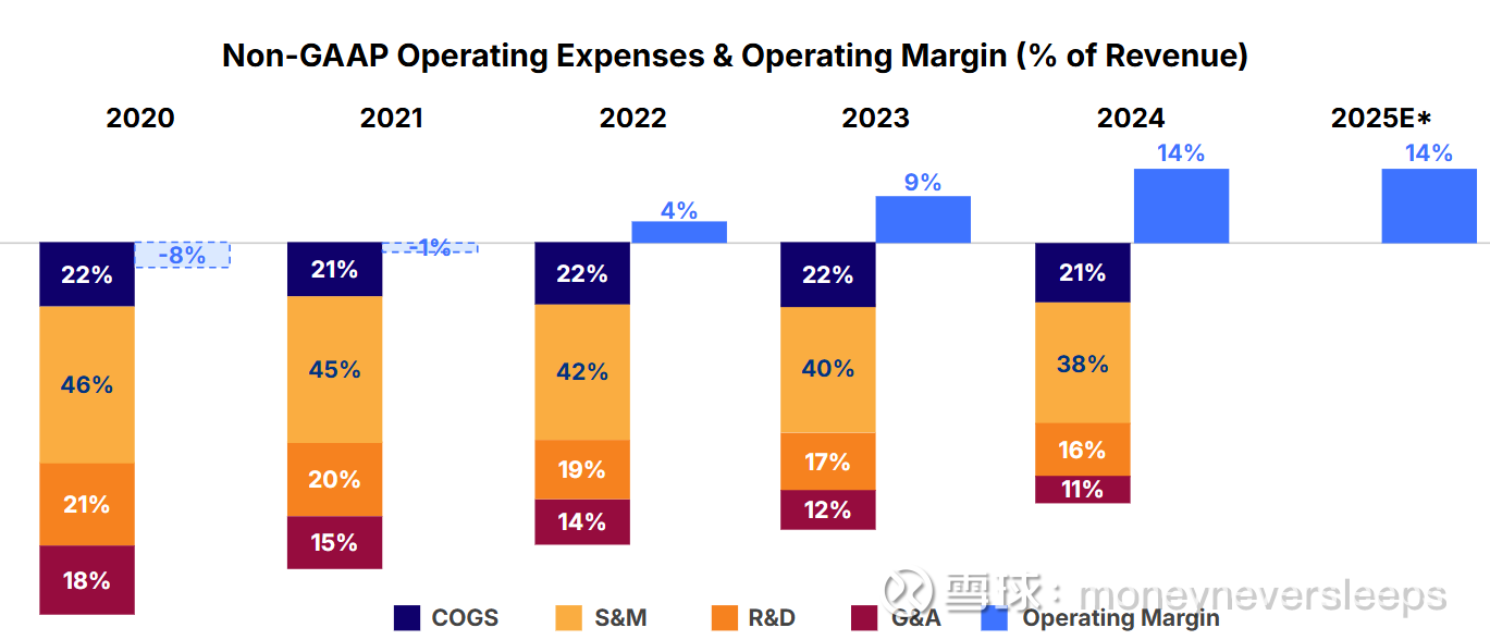 公司长期的毛利率目标也只是75-77%,不过因为费用率的降低,长期Non-GAAP OPM目标为20%+