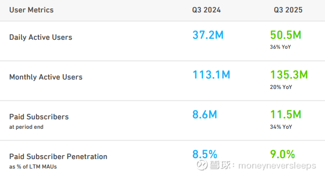 先看下主要指标的趋势,DAU Q3增速为36%,低于第二季度的40%;MAU Q3增速为20%,低于第二季度的24%。同时DAU/MAU Q3为0.373,和Q2的0.372类似。