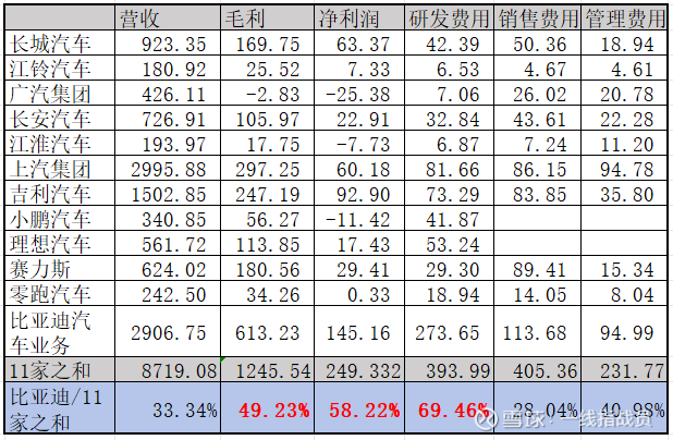 拿比亚迪跟另外11家上市公司(不含比亚迪)数据之和做一个对比,比亚迪汽车业务营收比例是比33%,毛利比例是49.23%,净利润比例是58.22%,研发费用比例是69.46%,销售费用比例是28.04%,管理费用是40.98%。