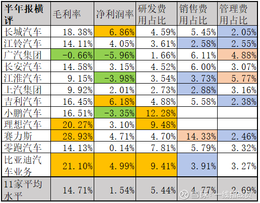 公布中报的国内上市公司车企有12家,蔚来尚未公布,小米的汽车业务占比太低,暂时对比一下比亚迪跟另外11家的数据。