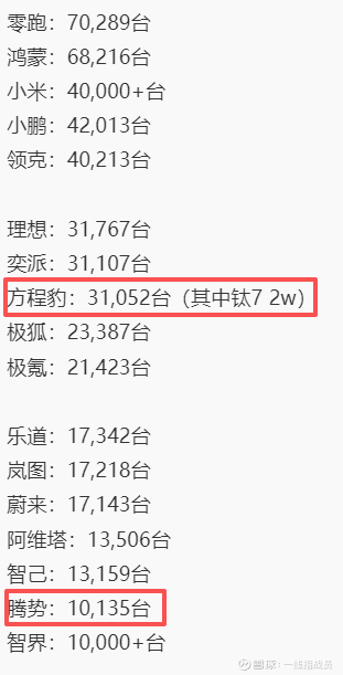 腾势+方程豹的销量,现在的位置大概是新能车新势力销量的前五的位置,随着后面新车型的产能提升,腾豹销量,可以稳定在新势力销量排名的前三。